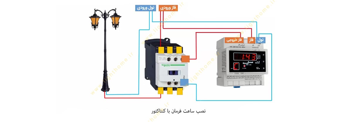 نحوه نصب ساعت فرمان به همراه کنتاکتور به این صورت است که سیم فاز و نول را به ورودی ساعت وصل می کنیم و از طرف دیگر این دو خروجی را به کنتاکتور وصل می کنیم. برای نصب ساعت فرمان از ریلی استفاده می شود که داخل تابلو برق قرار می گیرد و ساعت فرمان روی آن قرار داده می شود، پس از مراحل مونتاژ درون جعبه می توانید سیم ها را نصب کنید و تنظیمات ساعت فرمان را انجام دهید.