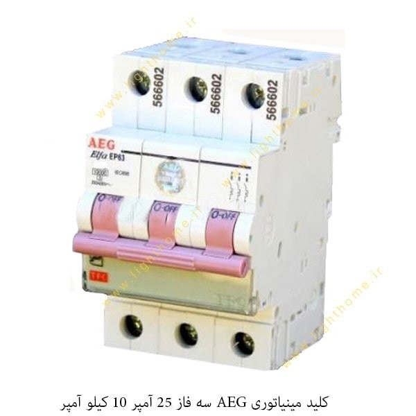 کلید مینیاتوری 25 آمپر سه فاز 10 کیلو آمپر AEG دارای انواع متفاوتی است که هر کدام از این فیوز ها دارای ویژگی هایی هستند که در مدار مناسب خود مورد استفاده قرار می گیرند. کلید مینیاتوری در نوع B ،C و D و ... در بازار موجود می باشد که نوع B برای مصارف روشنایی و خانگی به کار می رود. فیوز نوع B تحت عنوان کلید مینیاتوری تند کار شناخته می شود. فیوز های نوع C وD بیشتر در مصارف صنعتی به کار می روند و نوع C آن به فیوز کند کار معروف است. به فیوز نوع C، کلید مینیاتوری موتوری نیز گفته می شود و کند عمل کردن آن به این علت است که در مدار هایی که وسایل برقی با موتور الکتریکی وجود دارند نیاز به زمان بیشتری است تا موتور راه اندازی شود و عمل کند. پس کلید مهلت می دهد تا موتور الکتریکی موجود در مدار های الکتریکی راه بیافتند و به جریان نرمال خود برسد.