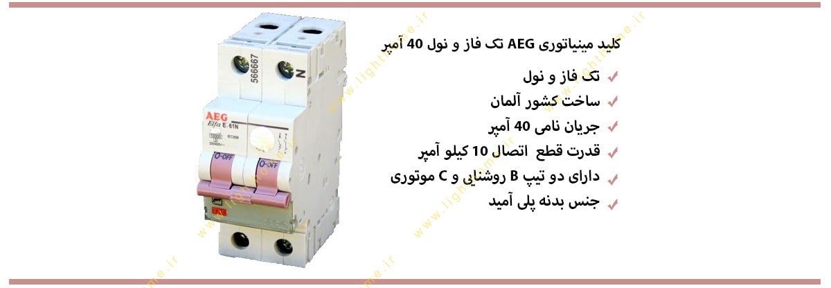 کلید مینیاتوری Aeg که دارای قدرت قطع جریان 10 کیلو آمپر می باشد و در دو نوع B و C تولید شده است که در زمان خرید نوع کلید مورد نظرتان را بین دو مدل B یا روشنایی و C یا موتوری انتخاب می کنید. کلید مینیاتوری تیپ B معمولا در منازل برای کاربردهای خانگی استفاده می شود و می تواند زمانی که جریان عبوری از مدار 3 تا 5 برابر جریان نامی مدار شد برق را قطع کند که این مدل کلید با نام تندکار نیز شناخته می شود و از آنجایی که زمان قطع جریان در کلید مینیاتوری تیپ C بیشتر است به نام کندکار شناخته می شود و در زمان اضافه بار بین 5 تا 10 برابر جریان نامی سریعا برق را قطع کرده تا به تجیهزات دیگر آسیب نرسد. کلید مینیاتوری تک فاز و نول 40 آمپر Aeg باید در محیط های داخلی به دور از عوامل طبیعی مانند تابش شدید نور خورشید یا بارش باران و برف و ... مورد استفاده قرار گیرد. به همین منظور باکس هایی به نام جعبه فیوز طراحی شده است تا محلی مناسب برای کلیدهای مینیاتوری فراهم آورد. کلید مینیاتوری AEG در شرایطی که اتصال کوتاه یا اضافه بار در مدار وجود داشته است بعد از قطع کردن مدار به راحتی به حالت قبل خود بر می گردد و نیازی به تعویض کردن آن ها نمی باشد. از کلید بارها می توان استفاده کرد. کلید به آسانی قابل نصب می باشد و دارای گارانتی به مدت یک سال است.