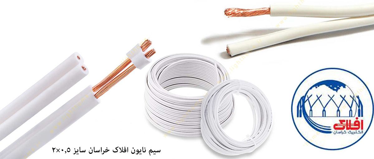 سیم نایلون افلاک خراسان سایز 0.5×2 نوعی سیم دو رشته ای سفید رنگ می باشد که با انعطاف بالا برای سیم کشی تجهیزات برقی و لوازم روشنایی مانند لوسترها به کار می رود و به شکل روکار نصب می گردد البته ناگفته نماند که استفاده از این سیم در دماهای بالا اصلا مجاز نیست. مهندسین و متخصصین حرفه ای شرکت ایرانی سیم و کابل افلاک الکتریک خراسان با استفاده از بهترین تکنولوژی های جهان اروپا و ماشین آلات نوین تولیدی و تعبیه متریال مرغوب مس، آلومینیوم و پلاستیک پرکاربرد پلی وینیل کلراید (PVC) سیم و کابل های باکیفیت و درجه یکی را در مدل های متفاوت افشان، مفتولی، ارت، شبکه، مخابراتی، اعلام حریق، کواکسیال و ... تولید کرده اند که با کیفیت بالا، اخذ تاییدیه های CE جهان اروپا و ایزو 9001 به بازارهای داخلی و خارجی عرضه می گردند و در بسیاری از پروژه های برق کشی ساختمان سازی ها، مراکز توزیع برق و مخابراتی استفاده می شوند.