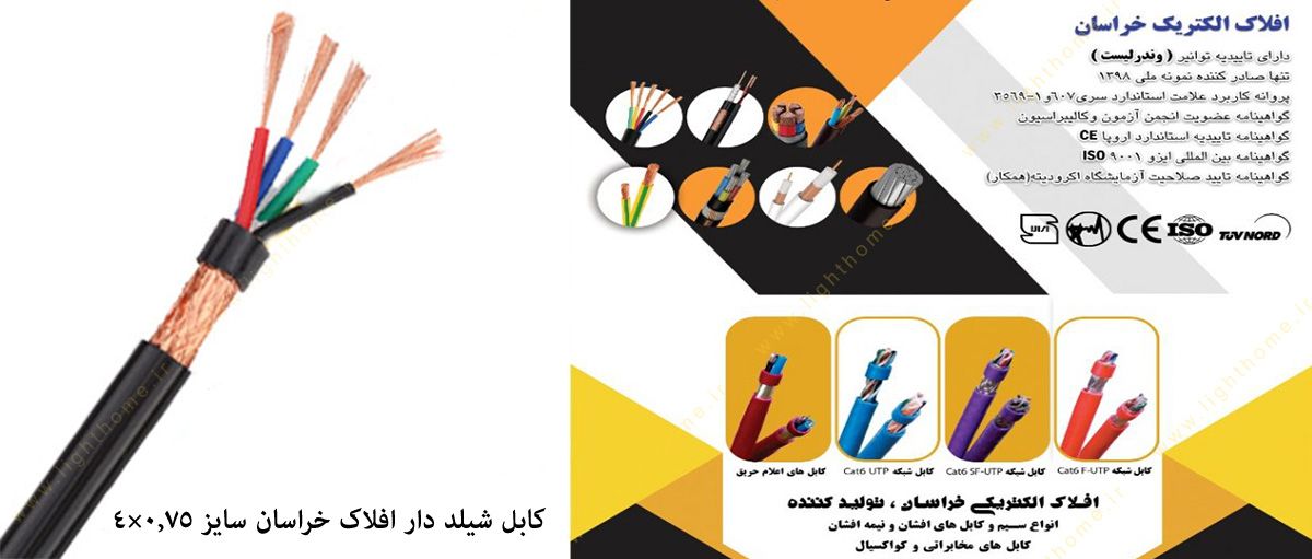 کابل های شیلددار افلاک خراسان از سطح مقطع 0.75 تا 2.5 میلی متر مربع به شکل 2، 3 و 4 رشته ای در بازار سیم و کابل ایران موجود هستند که با قیمت مناسب و مقرون به صرفه به صورت متری به فروش می رسند و برای تابلوهای فرمان، مکان هایی که میدان مغناطیسی در آنها وجود دارد، خطوط تولید، تهویه مطبوع، ابزار ماشین آلات و غیره به کار می روند. کابل شیلد دار چهار رشته ای سایز 0.75 افلاک خراسان از عمر مفید طولانی، کیفیت ساخت و دوام بالا، تاییدیه های جهان اروپا و ملّی ایران و ولتاژ نامی 300 تا 500 ولت برخوردار است و در مقایسه با کابل های بدون شیلد دارای وزن سنگین تری می باشد ولی به دلیل دفع نویزها و پالس های محیط و انتقال اطلاعات کابل بدون مشکل و آسیب مورد توجه بسیاری از خریداران قرار گرفته است.