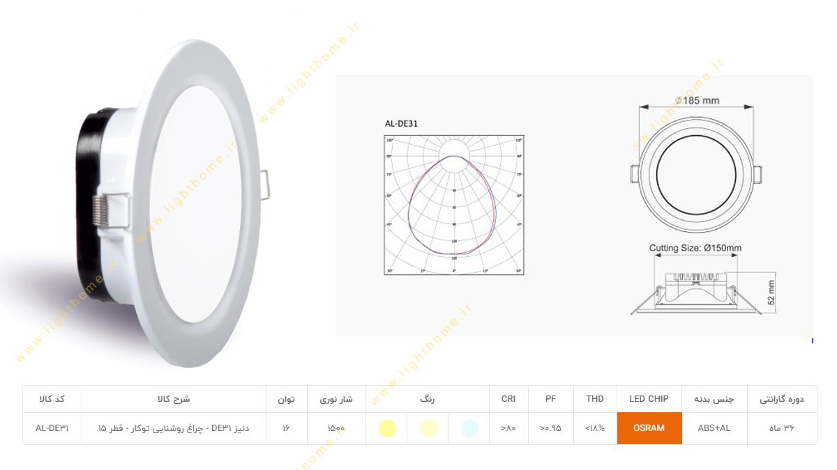 چراغ پنلی 16 وات SMD توکار آلتون رای ALTONRAY مدل دنیز AL-DE31 - توان 16 وات - شار نوری 1500 لومن - رنگ نورهای آفتابی، مهتابی و یخی - جنس بدنه آلومینیوم و ABS - قطر برش 15 سانتی متر - توکار