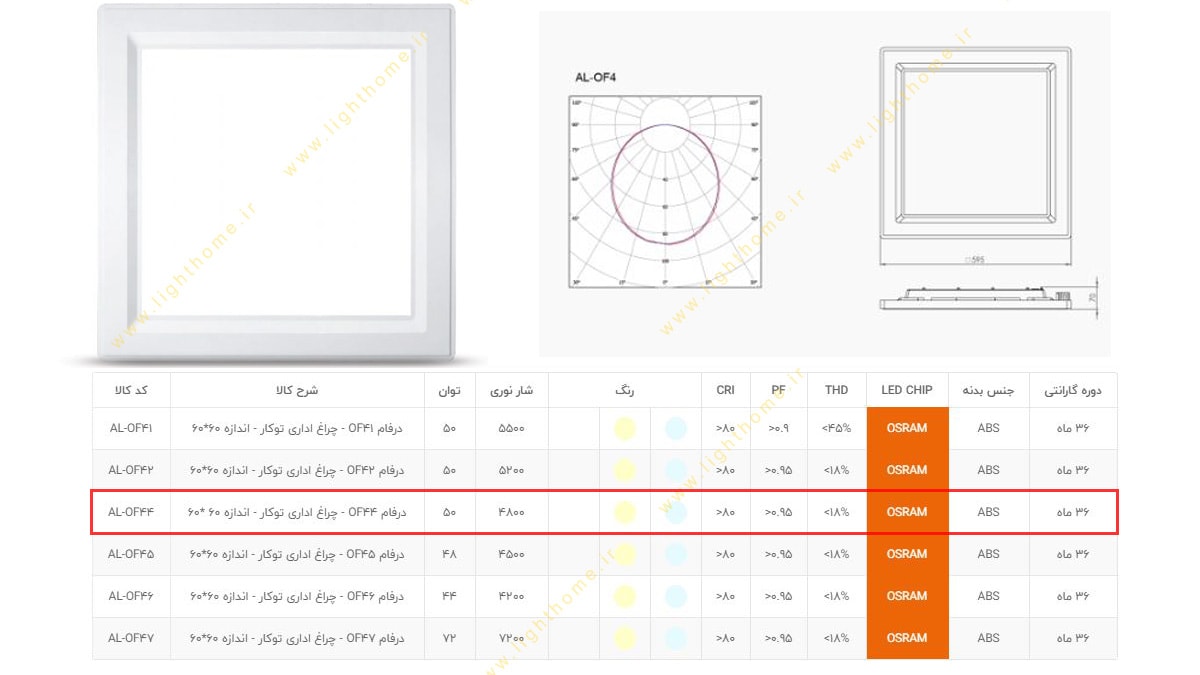 پنل 60x60 توکار 50 وات SMD آلتون رای ALTON RAY مدل درفام AL-OF44 - توان 50 وات - شار نوری 4800 لومن - رنگ نورهای آفتابی و مهتابی - جنس بدنه ABS - ابعاد بیرونی 60x60 سانتی متر - توکار