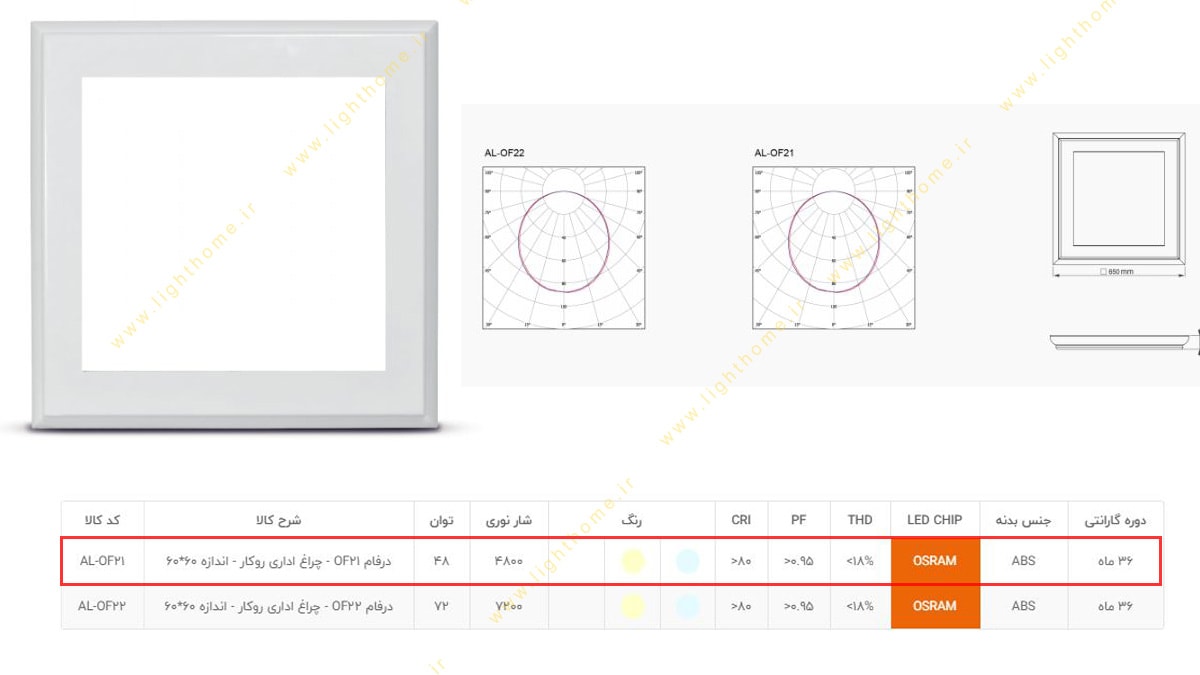 پنل 60x60 روکار 48 وات SMD آلتون رای ALTON RAY مدل درفام AL-OF21 - توان 48 وات - شار نوری 4800 لومن - رنگ نورهای آفتابی و مهتابی - جنس بدنه ABS - ابعاد بیرونی 60x60 سانتی متر - روکار