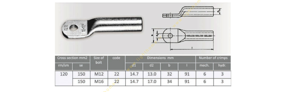 کابلشو پرسی آلومینیومی دم بلند برای سطح مقطع هادی 120 میلیمتر مربع تولید شده است. اندازه قطر سوراخ در آن 13 و 17 میلیمتر می باشد. قطر لوله کابلشو 14/7 میلیمتر می باشد. طول کابلشو 91 میلیمتر و عرض آن در دو مقدار 32 و 34 میلیمتر می باشد. اندازه پیچ اتصال نیز در این نوع کابلشو M12 و M16 می باشد.