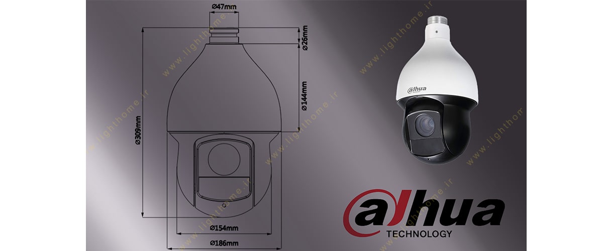 نمونه ی مورد بحث، دوربین مداربسته ی مدل DH-SD59230U-HNI است که با طراحی زیبا و خاصی در ابعاد 186*309 و وزن 3.9 کیلوگرم تولید شده است. این محصول دارای بدنه ای سفید رنگ و دارای جنس بدنه فلزی است که در مجموعه اسپید دام یا گردان PTZ دوربین های مدار بسته داهوا طبقه بندی می شود. این دوربین مقاومت بالایی در مقابل رطوبت و خشکی هوا دارد و با کنترل گرد و غبار محیط، تصاویری همیشه با کیفیت را ارائه می دهد. در قسمت میانی بدنه، لنز دوربین قرار گرفته و 4 ال ای دی دید در شب، اطراف لنز واقع شده اند تا حتی در تاریکی شب نیز تصاویر با کیفیتی را به نمایش در آورند. نصب این محصول به صورت سقفی و دیواری می باشد.