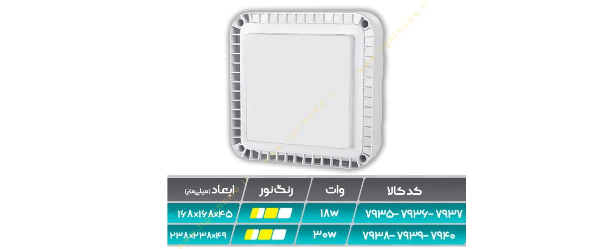 چراغ سقفی 30 وات روکار پارس شعاع توس مدل آوین - دارای سه رنگ نور آفتابی، مهتابی و یخی - شار نوری 2650 لومن - نصب روکار - ابعاد بیرونی آن 238x238x49 میلی متر - مجهز به لامپ SMD LED - مصرف کم انرژی - جریان ورودی 300 میلی آمپر