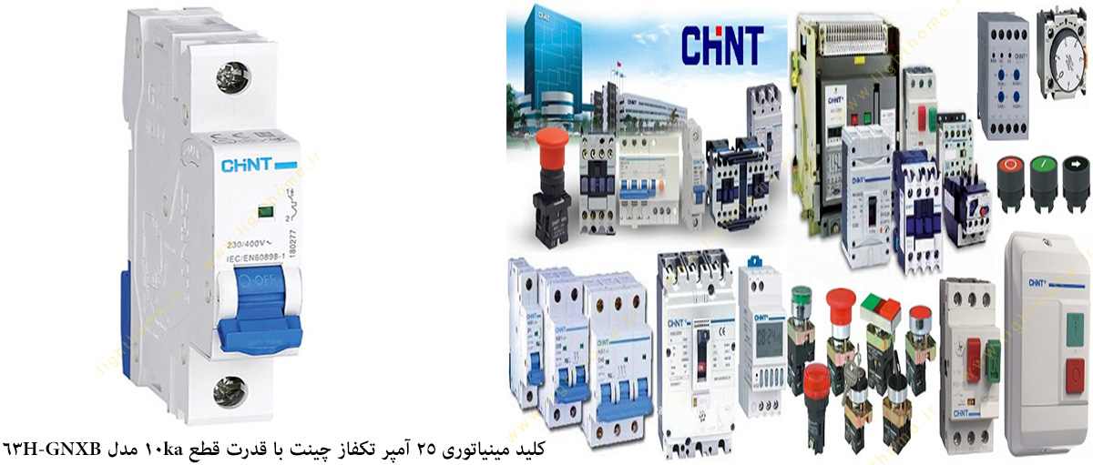 کلید مینیاتوری 25 آمپر تکفاز چینت با قدرت قطع 10 کیلو آمپر مدل GNXB-63H از نوع کلیدهای مینیاتوری تیپ C (تیپ موتوری) است که برای مصارف برق خانگی و موتوری مانند : پمپ های آب خانگی، موتور کولر گازی، موتورهای القایی، موتورهایی با توان کم و جریان های راه اندازی پایین و بارهایی با ضریب اشباع پایین استفاده می شود و مدار را در جریان های اضافه بار بین 5 تا 10 برابر جریان نامی قطع می نماید. در بازار برق ایران کلید مینیاتوری چینت سری GNXB-63H از رنج جریان 6 تا 63 آمپر در دو نوع تک پل و سه فاز موجود هستند که با قدرت قطع 10 کیلو آمپر و نمایشگر قطع و وصل برای حفاظت از مدارهای الکتریکی در برابر جریان های ناخواسته و غیرمجاز به کار می روند و از کیفیت ساخت و دوام بالا، عمر مفید طولانی و تاییدیه های بین المللی برخوردار هستند.