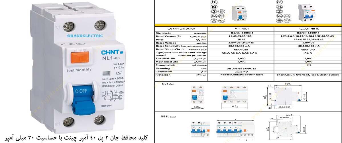 کلید محافظ جان 2 پل 40 آمپر چینت با حساسیت 30 میلی آمپر مدل NL1-63 مطابق استاندارد IEC/EN 61008-1 در کشور چین و کمپانی چینت الکتریک توسط متخصصین برق حرفه ای با استفاده از ماشین آلات به روز دنیا، برترین تکنولوژی های جهان اروپا و مواد اولیه باکیفیت و مرغوب ساخته شده است و با عمر مفید الکتریکی و مکانیکی، قدرت قطع 6 کیلو آمپر، ولتاژ کارکرد 240 تا 415 ولت AC و میزان حساسیت 30 میلی آمپر عرضه می گردد. کلید محافظ جان چینت مدل NL1 در بازار برق ایران از رنج جریان 25، 40 و 63 آمپر در دو نوع دو پل و چهار پل (تک فاز و سه فاز) موجود هستند که به عنوان یک کلید قطع کننده جریان برق در تابلوهای برق نصب می شوند تا بلافاصله بعد از به وجود آمدن جریان غیرعادی در شبکه توزیع برق و قبل از آسیب رسیدن به تجهیزاتی که به برق متصل هستند جریان برق را قطع کند.