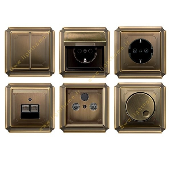 کلید و پریز EDCO سری آنتیک برنز – دارای کادر برنزی - رویه در رنگ های برنز و طلایی قابل انتخاب - طراحی زیبا و منحصر به فرد - دارای تنوع بالای مکانیزم