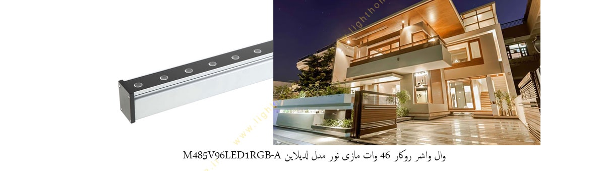 وال واشر نمای ساختمان روکار 48 وات مازی نور مدل لدیلاین M485V96LED1RGB-A - دارای لنز Oval - رنگ نور RGB - توان 48 وات - شار نوری 1300 لومن - ابعاد بیرونی 960x60x80 میلی متر - IP65 - طول عمر 50000 ساعت - جنس بدنه پروفیل آلومینیوم اکسترودی - پوشش بدنه آنودایز