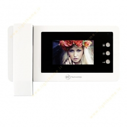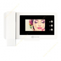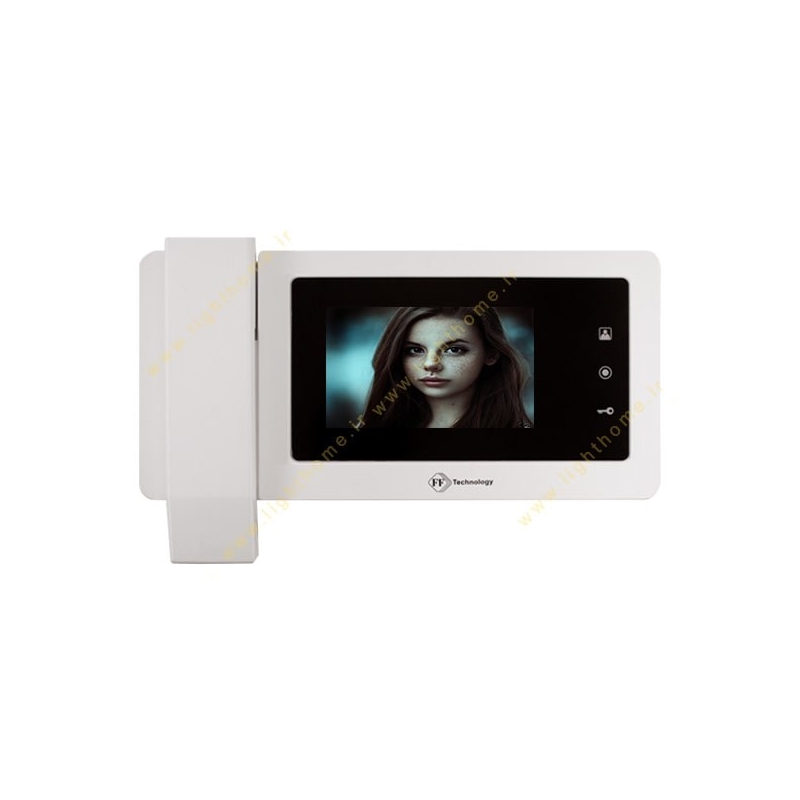 درب باز کن تصویری اف اف تکنولوژی دارای مانیتور رصفحه کلید لمسی 4.3 اینچ بزرگ با تصویر رنگی مستطیل شکلی است که با قابی سیاه رنگ در سمت راست گوشی ارتباط با مراجعه کننده نمایان می باشد. در طراحی آیفون تصویری اف اف تکنولوژی هیچ دکمه یا کلیدی به کار برده نشده و نمایشگر لمسی تمامی دسترسی های کاربردی مورد نیاز در یک درب باز کن تصویری مجهز را در قالب سه دکمه لمسی درون مانیتور سمت راست در اختیار قرار خواهد داد. تنها طرح قابل مشاهده در طراحی این مدل آیفون تصویری، نشان برند اف اف تکنولوژی میباشد که پایین قاب دور مانیتور به چشم می خورد.
