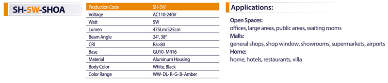لامپ هالوژن COB شعاع مدل SH-5W در مقایسه با لامپ های کم مصرف معمولی نیز فاقد اشعه های مضر هم چون فرابنفش می باشد. از مشخصات این لامپ می توان به ولتاژ کاری 240-110 ولت AC و توان مصرف 5 وات آن اشاره کرد. این محصول دارای 40000 ساعت متوسط طول عمر می باشد که از نظر اقتصادی بسیار به صرفه بوده و به منظور ایجاد تمرکز نور مناسب از لنز با زاویه انتشار نور 24 و 38 درجه بهره برده است. نوع اتصال آن به دو صورت پایه استارتی (GU10) و پایه سوزنی (MR16) می باشد و شاخص بهره نوری (CRI) آن بالاتر از 80 درصد و مقدار شار نوری آن 475-525 لومن است. بدنه این محصول در دو رنگ سفید و مشکی ساخته شده است و دارای رنگ بندی های مختلف از جمله سفید، آفتابی، قرمز، سبز، آبی و زرد می باشد. شما می توانید برای خرید لامپ ال ای دی هالوژنی 5 وات شعاع مدل shoa-5w و اطلاع از قیمت لامپ هالوژن COB شعاع 5 وات به سایت لایت هوم مراجعه نمایید.