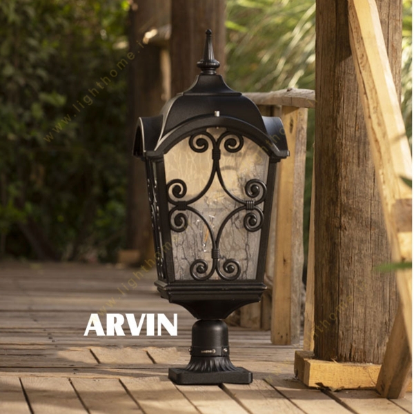 چراغ سرلوله حیاطی شفق مدل کیوان 6074 جنس بدنه آلومینیوم دایکاست رنگ پودری الکترواستاتیک رنگ بدنه مشکی، سفید و مسی ایستاده سرپیچ E27 درجه حفاظت IP44