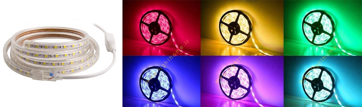 ریسه نواری SMD ال ای دی 220 ولت 3528 ای دی سی - رنگ نور آبی، آفتابی، ارغوانی، زرد، سبز، سفید، قرمز و نارنجی - شاخص نمود رنگ 80 - فروش به صورت رول 50 متری - تراکم در هر متر 60 - شار نوری 240 لومن بر وات - زاویه پخش نور 120 درجه - توان مصرفی 4 وات بر متر