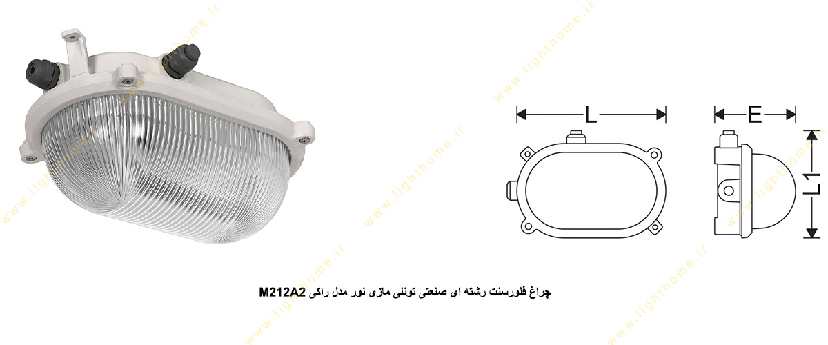 چراغ فلورسنت رشته ای صنعتی تونلی مازی نور مدل راکی M212A2 - قابل استفاده با لامپ 150 و 200 وات فلورسنت کامپکت بالاست سرخود رشته ای - درجه حفاظت IP66 - نصب به صورت روکار سقفی و دیواری سقفی - کاربرد محیط های صنعتی - کلاس عایقی Class I - بدنه ی محکم - پخش نور متقارن یکنواخت - سرپیچ های مدل E27 از جنس پرسلین - نوع حباب شیشه ای طرح پرزماتیک شفاف - قابلیت لوپینگ - نوار آببندی سیلیکونی