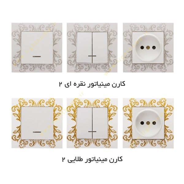 کلید و پریز جهان الکتریک مدل کارن با قاب مینیاتور در طرح های مختلف – دارای قاب طرح دار مینیاتور 1، مینیاتور 2، حاشیه طلایی و نقره ای – رنگ قاب میانی سفید و بژ قابل انتخاب – نصب توکار – تنوع مکانیزم بالا - قابلیت انتخاب رنگ قاب و رنگ رویه به صورت مجزا
