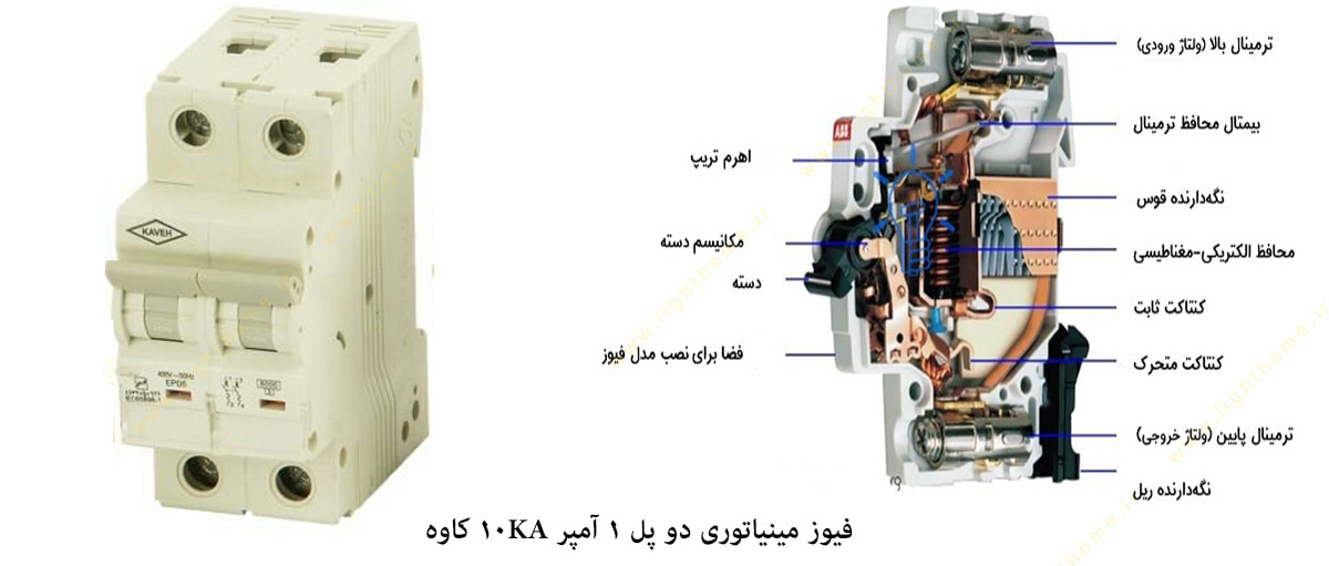 فیوز مینیاتوری دو پل 1 آمپر 10KA کاوه دارای قابلیت استفاده در جریان های متناوب یا AC را داشته که برای جریان های مستقیم یا DC قابل بکارگیری نبوده چرا که منجر به ایجاد خطراتی مانند قطع در زمان اتصال کوتاه شده و همچنین در اضافه بارها باعث سوختن تدریجی کنتاکت و در نتیجه سبب اتصال نامناسب کنتاکت ثابت و متحرک و ایجاد حرارت می شود. فیوز مینیاتوری کاوه در تعداد پل ها و جریان نامی های مختلفی عرضه شده که همه این مدل ها در سایت لایت هوم موجود بوده و شما می توانید برحسب محل نصب آن، هر کدام را انتخاب نمایید. این کلیدها دارای بخش های مختلفی بوده که شامل پوسته، مگنت، دستگیره کلید، بی متال، جرقه گیر و ترمینال ها می باشد. کلید مینیاتوری یک محافظ مدار است که از مدار در مقابل اتصال کوتاه و جریان اضافه بار محافظت می کند.