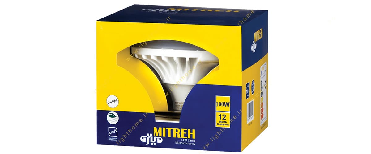 لامپ 100 وات قارچی میتره در ظاهری متفاوت و زیبا با نوردهی 8500 لومن به همراه سرپیچ مناسب و استاندارد E27 در دو رنگ نور آفتابی 3000K و مهتابی 6500K طراحی و ساخته می شوند. به دلیل شکل ظاهری و طول عمر بالا محصول از شاخص نمود رنگ بیش از 80 و بازدهی 90 لومن بر وات برخوردار می باشد و معادل یک لامپ 1000 وات رشته ای عمل می کند. از قرار دادن و نصب چراغ قارچی 100 وات ال ای دی میتره با سرپیچ E27 در مجاورت اشیاء قابل اشتعال، مکان هایی با فضای کاملا بسته، دمای بالا و محیط هایی با احتمال ریزش آب خودداری نمایید.چراغ LED قارچی 100 وات میتره با سرپیچ E27