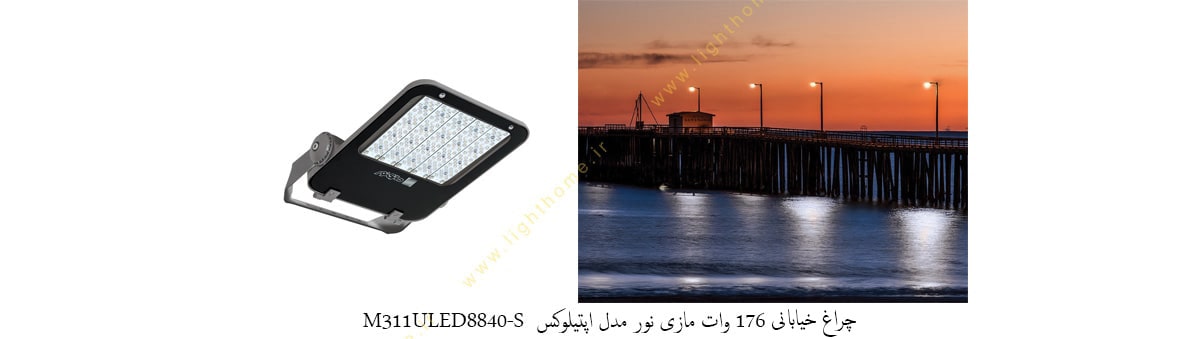 چراغ خیابانی 176 وات LED مازی نور مدل اپتیلوکس M311ULED8840-S - جنس بدنه آلومینیوم دایکاست – رنگ پودری الکترواستاتیک - دارای رنگ بدنه طوسی - توان 176 وات - شار نوری 22000 لومن - IP66 - طول عمر بیش از 50000 ساعت - CRI70 - رنگ نور مهتابی