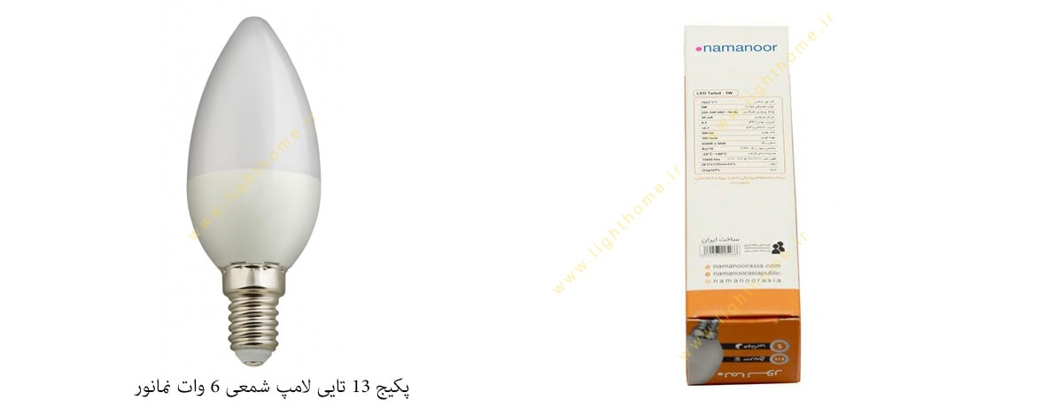 پکیج 13 تایی لامپ شمعی 6 وات نمانور دارای 13 عدد لامپ شمعی با توان هر کدام 6 وات است که میزان روشنایی مناسبی را در محیط ایجاد می کند. این پکیج روشنایی در دو رنگ نور آفتابی و مهتابی می باشد که هردوی این رنگ نورها در سایت لایت هوم موجود بوده و شما می توانید برحسب نیاز خود هر کدام از آنها را خریداری نمایید. این پکیج ها صرفه اقتصادی بالایی داشته و به همین دلیل در تعداد و توان های مختلفی تولید می شود که از این مدل در دو مدل 5 و 8 تایی نیز توزیع شده و هردوی آنها در این سایت موجود است. نوع سرپیچ بکار رفته شده در آن شمعی یا E14 می باشد که با بیشتر لامپ ها و چراغ ها قابلیت هماهنگی دارد. پکیج ها طرفدارارن زیادی داشته و به همین دلیل در تنوع بالایی از نوع لامپ تولید می شود که در این مدل ها شامل لامپ های استوانه ای، حبابی، شمعی و هالوژنی بوده و همگی در این سایت در دسترس و قابل خریداری است.