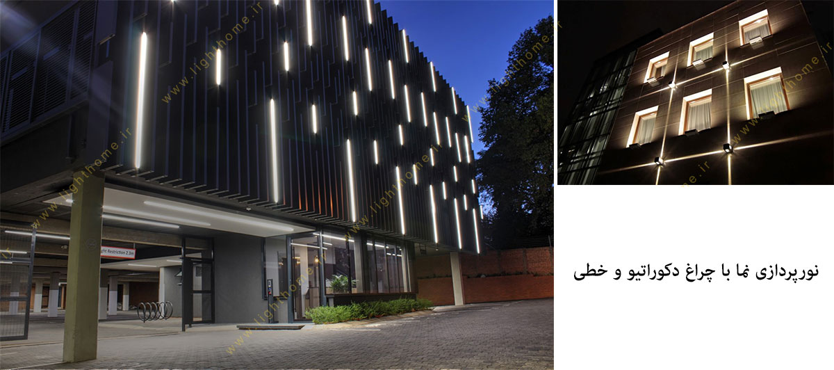 نورپردازی نمای ساختمان با چراغ دیواری و چراغ خطی