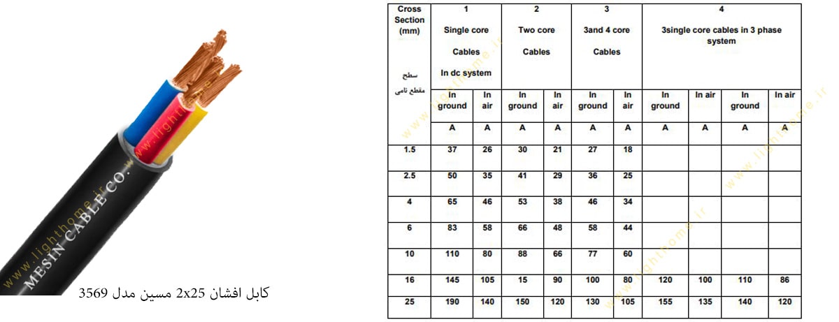 کابل افشان 2x25 مسین مدل 3569 همانطور که از نام آن مشخص است دارای دو رشته سیم به قطر 25 میلی متر می باشد که در تنوع زیادی از اندازه و تعداد سیم عرضه شده و همه این مدل ها در سایت لایت هوم موجود می باشد. ولتاژ نامی آن 600 تا 100 ولت است که به حداکثر ولتاژ قابل عبور از سیم و کابل گفته می شود. بدنه کابل از جنس PVC است که از انتقال جریان برق به بیرون جلوگیری کرده و مانع از خوردگی و پوسیدگی کابل می شود. این کابل دارای هادی های مس کلاس 5 بوده که میزان خمش زیاد و مقاومت کمی داشته و برای محیط هایی که نیاز به انعطاف پذیری بالایی دارد، کاربردی است و از این کابل در محیط های ساختمانی و وسایل برقی استفاده می شود. محصولات مسین کابل همگی همراه با کیفیت و طول عمر زیادی عرضه می شود که با استاندارد ملی ISIRI (607) 53 همراه بوده و خرید مطمئن و مقرون به صرفه ای را برای مشتریان عزیز رقم می زند.