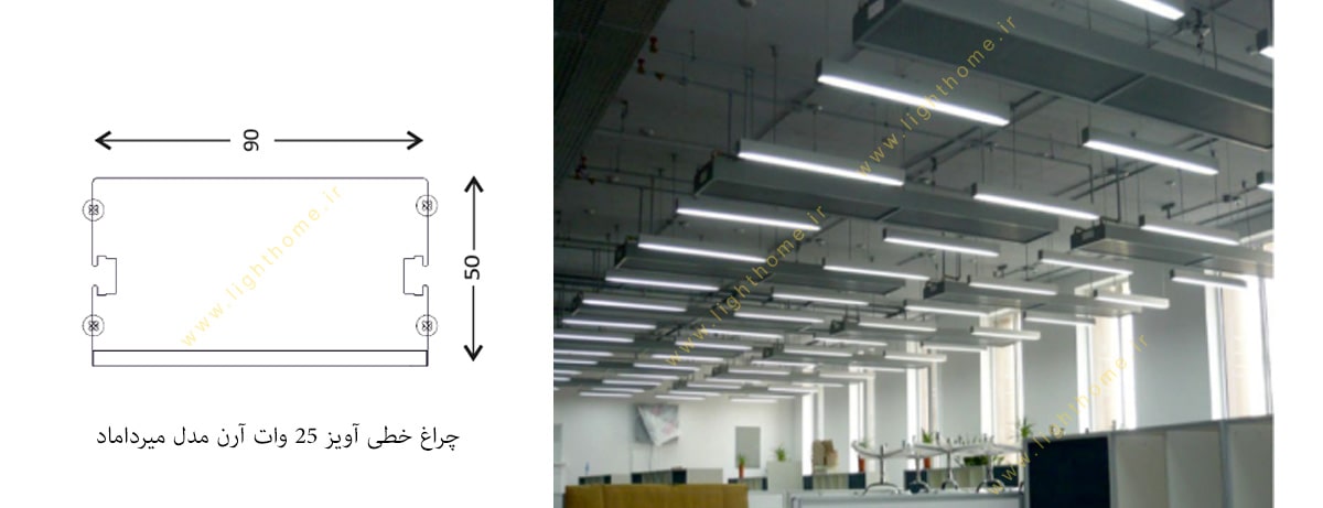 چراغ خطی آویز 25 وات آرند دارای عرض متوسط می باشد که از این چراغ در عرض کم و پهن نیز عرضه شده و شما می توانید بسته به نیاز خود هر کدام از این مدل ها را انتخاب و خریداری نمایید. این چراغ خطی آویز مجهز به لامپ LED می باشد که این لامپ ها مصرف انرژی کم و نوردهی بالایی داشته که منجر به آسیب به چشم و خستگی آن نشده و برای محیط های پر مصرف گزینه مناسبی می باشد. نصب چراغ بصورت آویز و روکار امکان پذیر است و از آن می توانید در محیط هایی مانند منازل، اداره ها، شرکت ها، بیمارستان ها و رستوران ها استفاده نمایید. طول عمر این نوع لامپ ها زیاد بوده و در اثر استفاده طولانی مدت از آن و یا روشن و خاموش کردن های مکرر، دچار سوختگی و یا افت نوردهی نمی شود.