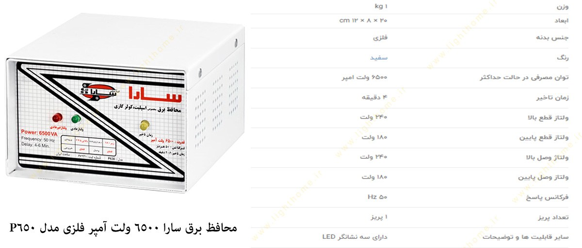 کاربران گرامی شما عزیزان می توانید برای خرید محافظ برق سارا 6500 ولت آمپر فلزی مدل P650 و اطلاع از قیمت محافظ برق سارا 6500 ولت آمپر فلزی مدل P650 به سایت معتبر لایت هوم مراجعه نمایید و نسبت به خرید خود اقدام کنید.