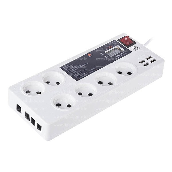 محافظ ولتاژ دیجیتال گلدن لاین مدل usb 401 با سیم 1.5 متری در واقع یک چند راهی با کیفیت و زیبا است که بدنه ای مستطیل شکل و سفید رنگ دارد این محافظ برق ولتاژ دارای 6 خروجی برق جهت اتصال دوشاخه می باشد و می توان از هر 6 پریز به طور هم زمان استفاده کرد البته یکی از نکاتی که در این محافظ برق رعایت شده است زاویه پریزها است که به به صورت 45 درجه قرار گرفته اند تا سیم دوشاخه ها در فاصله های بیشتری از هم قرار بگیرند.