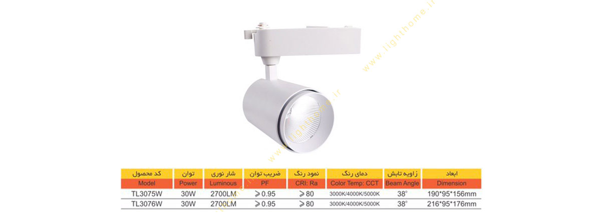 چراغ ریلی 30 وات سان لوکس مدل TL3075 W - لامپ COB - توان 30 وات - دارای نور آفتابی K3000 ، مهتابی K4000 و طبیعی K6500 - ابعاد 190×95×156 میلیمتر - نمود رنگ چراغ بالای 80 - رنگ بدنه سفید