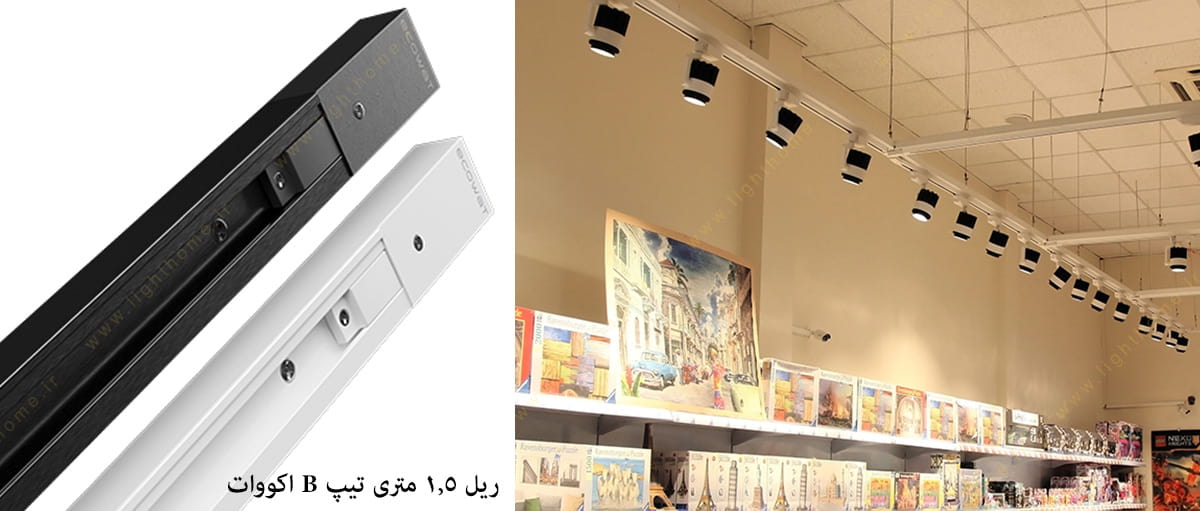 چراغ های ریلی نسل جدیدی از سیستم های روشنایی و نورپردازی هستند که ضمن تامین نور باعث زیباسازی فضاهای داخلی و دکوراسیون ها می شوند و با توجه به نوع نیاز خریدار برای منازل مسکونی، فروشگاه ها، مراکز تجاری و اداری، گالری ها، موزه ها، کافه ها، هتل ها و رستوران ها به کار می روند و بر روی ریل های روکار یا توکار که به روش آویز، روکار یا توکار بر روی سقف نصب می گردند، تعبیه می شوند. ریل 1.5 متری تیپ B اکووات در دو مدل ریل رابط و ریل سرخط با رنگ بدنه های مشکی و سفید تولید شده که به دلیل وجود ترمینال در ریل سرخط طول مفید آن 8 سانتی متر کوتاه تر از ریل رابط است و این ویژگی تنها تفاوت این دو مدل ریل می باشد که آنها را از یکدیگر متمایز کرده است.