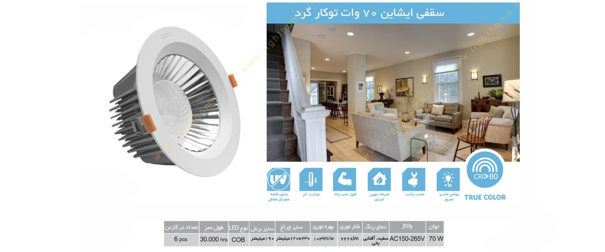 چراغ سقفی توکار 70 وات مدل ایشاین نوعی چراغ COB توکار EDC است که می باشد که از نظر ظاهری به شکل گرد بوده و برای نصب نیاز به یک برش دایره ای شکل با قطر 190 میلی متر می باشد تا بتوان این محصول که دارای ابعاد 230×120 میلی متر می باشد را در خود جای دهد. چراغ های سقفی توکار از جمله محصولات روشنایی بسیار پر مصرف جهت نور بخشیدن به محیط می باشند. از این گونه چراغ ها در جاهایی نظیر منازل مسکونی، ویلا ها، رستوران ها، فروشگاه ها، اتاق های نمایش، موزه ها و ... استفاده می شود. رنگ نور این نوع چراغ ها رنگ های سفید، آفتابی و یخی می باشد که با توجه به سلیقه مصرف کننده دکور به کار رفته در محیط نصب و نوع استفاده از محیط نصب می توان رنگ نور مناسب را انتخاب نمود.