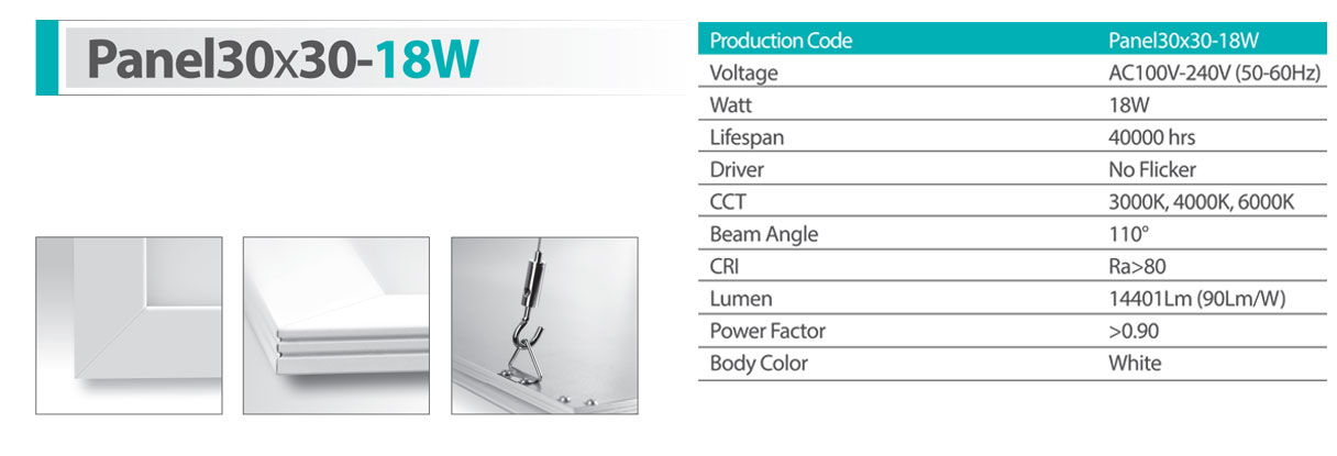 چراغ پنلی توکار سقفی شعاع – 18 وات توان - زاویه تابش نور 110 درجه – ولتاژ 100 تا 240 ولت – شار نوری 1440 لومن – ابعاد 30*30 سانتی متر