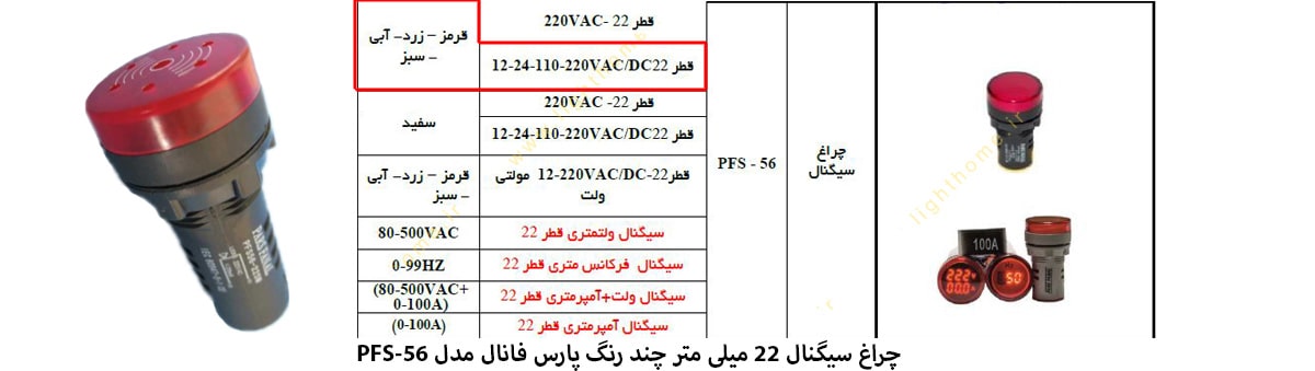 چراغ سیگنال قطر 22 میلی متر 12-24-110-220 VAC/DC پارس فانال مدل PFS-56 با چند رنگ نور - قطر 22 میلی متر - ولتاژ 12-24-110-220 VAC/DC - رنگ نور قرمز، زرد، آبی و سبز - دو سال ضمانت
