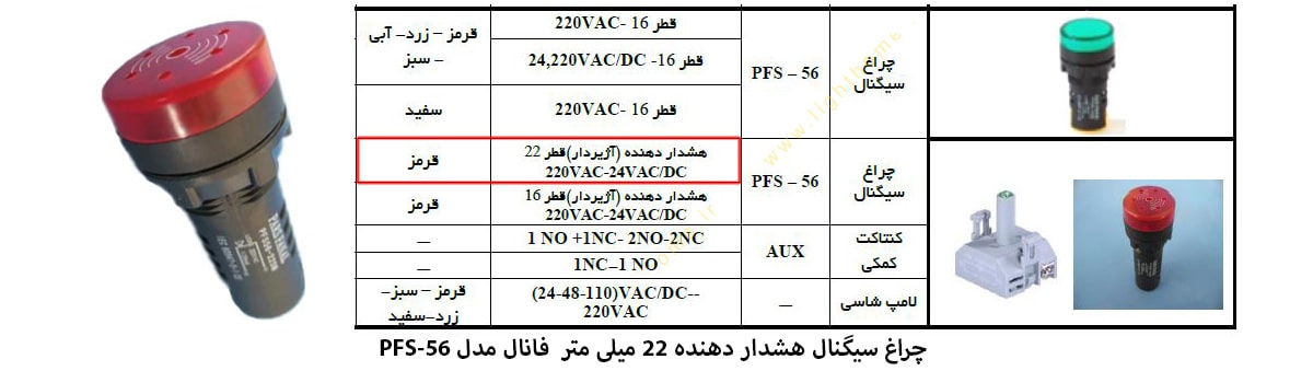 چراغ سیگنال قطر 22 میلی متر آژیردار پارس فانال مدل PFS-56 در رنگ نور قرمز بوده و بطور کلی این چراغ ها در مدل های تکی ساده و ال ای دی موجود می باشند. . کار اصلی چراغ سیگنال در تابلو برق ها جهت نشان دادن برق دار بودن تابلو، روشن و خاموش بودن مدار و تریپ می باشد و هر کدام از رنگ ها در صورت روشن بودن نشان دهنده اخطار و یا علامتی می باشد که توسط اپراتور قابل شناسایی است. محصولات پارس فانال دارای کیفیت بالا و طول عمر زیادی می باشد و همگی با دو سال ضمانت کالا عرضه گشته و همین موضوع سبب جلب رضایت مشتریان عزیز در طی این سالها شده است.