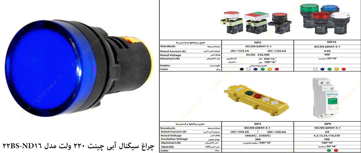 چراغ سیگنال آبی چینت 220 ولت مدل ND16-22BS/4Blue از یک بدنه پلاستیکی، درپوش آبی رنگ و یک لامپ LED تشکیل شده است و به منظور نمایش وضعیتی خارج از سه وضعیت زرد، قرمز و سبز استفاده می شود و بیشترین کاربرد آن برای مواقعی است که نیاز به اقدامی از سمت اپراتور باشد. چراغ سیگنال یا لامپ سیگنال که با نام های دیگر چراغ هشدار دهنده، چراغ آلارم و چراغ نشان دهنده هم شناخته می شود به عنوان یک لامپ هشدار دهنده LED در تابلوهای برق مختلف از قبیل : تابلو برق مخابرات، تابلو برق صنعتی، تابلو برق ماینر، شبکه و تابلوهای توزیع نصب می گردد و به واسطه ی دارا بودن بدنه پلاستیکی که همانند پیچ طراحی شده با استفاده از مهره بر روی تمامی ماشین آلات صنعتی تعبیه می شود.