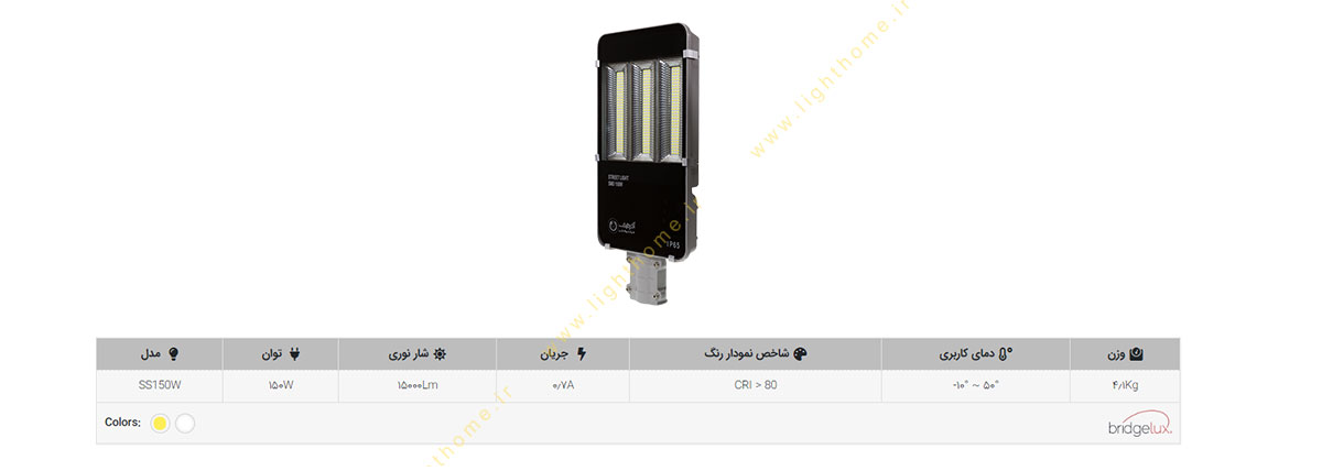 چراغ خیابانی 150 وات SMD مدل SS150W آذر طیف همان طور که از نامش مشخص است دارای لامپ اس ام دی کم مصرف با توان 150 وات است . این چراغ با توان 150 وات شار نوری 15000 لومن ایجاد می کند. دمای مناسب محیط برای این چراغ خیابانی 10- تا 50 درجه سانتیگراد است و شاخص نمود رنگ (CRI) آن بالای 80 می باشد. شاخص رنگ بالای 80 نشان دهنده رنگ واقعی اشیا زیر نور می باشد. نوع لامپ که اس ام دی است موجب ایجاد نوری یکنواخت با کیفیت بالا و بدون سوسو می باشد. در طراحی چراغ سه ماژول جداگانه برای پخش نور عالی صورت گرفته است. در ساخت محصول از چیپ های بریجلوکس با بهره نوری 130 لومن بر وات استفاده شده است. قاب این محصول مناسب برای استفاده در تمامی اقلیم ها است و درجه حفاظت آن IP65 است که چراغ را مقاوم در برابر عوامل جوی و محیطی کرده است. چراغ های خیابانی به طور کلی در برابر سرما، گرما، رطوبت، گرد و غبار و ... مقاومت لازم را دارد و آسیب نمی بیند. در ساخت این چراغ از تکنولوژی جریان ثابت درایورلس، با به کارگیری IC های تنظیم جریان استفاده شده است. برای جلوگیری از هدر رفتن نور چراغ و هدایت هر چه بهتر نور رفلکتور طراحی شده است. سرلوله خیابانی استاندارد (حداقل 5 سانتی متر و حداکثر 6 سانتی متر برای قطر لوله) نیز در این چراغ استفاده شده است.