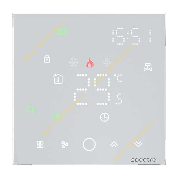ترموستات هوشمند اسپکتر سری TSR13 مدل دو لوله - وای فای دارای نمایشگری است که دمای محیط را نشان می دهد و با طراحی مدرنی که دارد می تواند جلوه و زیبایی خاصی را به محیط شما ببخشد. این ترموستات دارای مانیتور دات ماتریکس رنگی که شما می توانید متناسب با دیگر المان های محیط یکی از این رنگ ها را انتخاب نمایید. این کلید هوشمند را می توان به سنسورهای تشخیص حرکت متصل کرد و همچنین دارای قابلیت سناریو پذیری و قفل شدن نیز می باشد.
