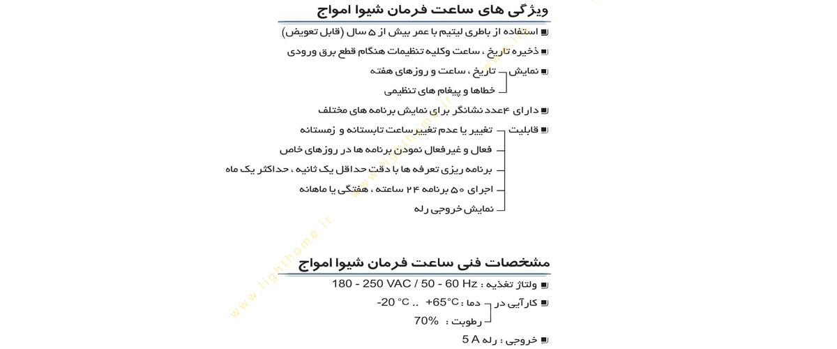 صفحه نمایش این ساعت فرمان شیوا امواج مدل ماهانه می تواند تاریخ، ساعت و روزهای هفته را نشان داده و در صورت داشتن خطا و یا در هنگام تنظیم آن، پیغام های ورودی به آن را نیز نشان می دهد. این ساعت فرمان شیوا امواج دارای قابلیت تغییر یا عدم تغییر ساعات تابستان و زمستان را داشته و می تواند در صورت نیاز در روزهای خاص ماه فعال و یا غیر فعال شود. تنظیمات برنامه های آن می تواند از زمان حداقل یک ثانیه و حداکثر یک ماه باشد و همچنین 50 برنامه را روزانه، هفتگی و یا ماهانه اجرا نماید. ولتاژ تغذیه مورد نیاز آن 180-250 VAC / 50-60 Hz که با مقدار ولتاژ شهری برابر بوده و می تواند به خوبی با آن کار کند و قابلیت استفاده در محیط های مختلف را داشته و از دمای -20 تا مثبت 65 و با رطوبت 70% می تواند به خوبی کار کرده و دچار خرابی و یا سوختگی نشود.