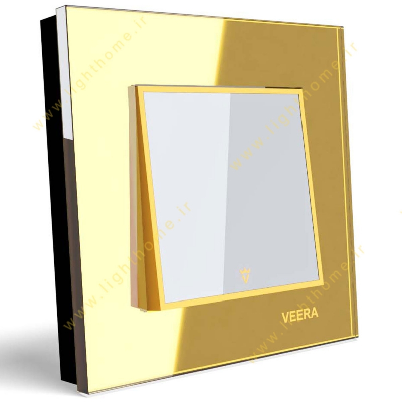 کلید و پریز Veera مدل امگا طرح شیشه طلایی (قاب طلایی - زه دور کلید طلایی - کلید سفید) – دارای بدنه طرح شیشه ای طلایی رنگ – رویه کلید و پریز پلکسی شفاف سفید با زه طلایی – نصب توکار – دارای 5 سال گارانتی و خدمات پس از فروش – طراحی منحصر به فرد و زیبا