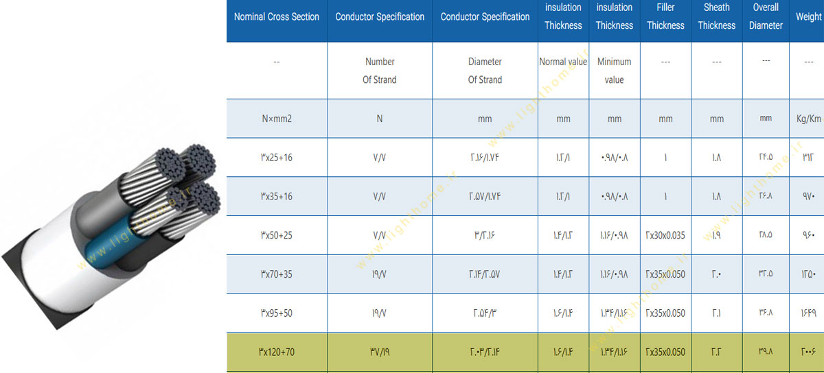 کابل آلومینیوم 3x120+70 مشهد از ولتاژ اسمی بسیار استانداردی در محدوده 0.6 الی 1 کیلوولت برخوردار می باشد.این کابل سه و نیم رشته از هادی آلومینیومی ساخته می شود. از نظر عملکردی هادی های آلومینیومی و هادی های مسی هر دو مشابه می باشند و در واقع جریان الکتریکی را از یک نقطه به نقطه دیگر انتقال می دهند. از نظر فرم هندسی هادی به کار رفته در این کابل به شکل قطاعی می باشد. کلاسی که برای هادی این نوع سیم و کابل در نظر گرفته شده 2 می باشد.